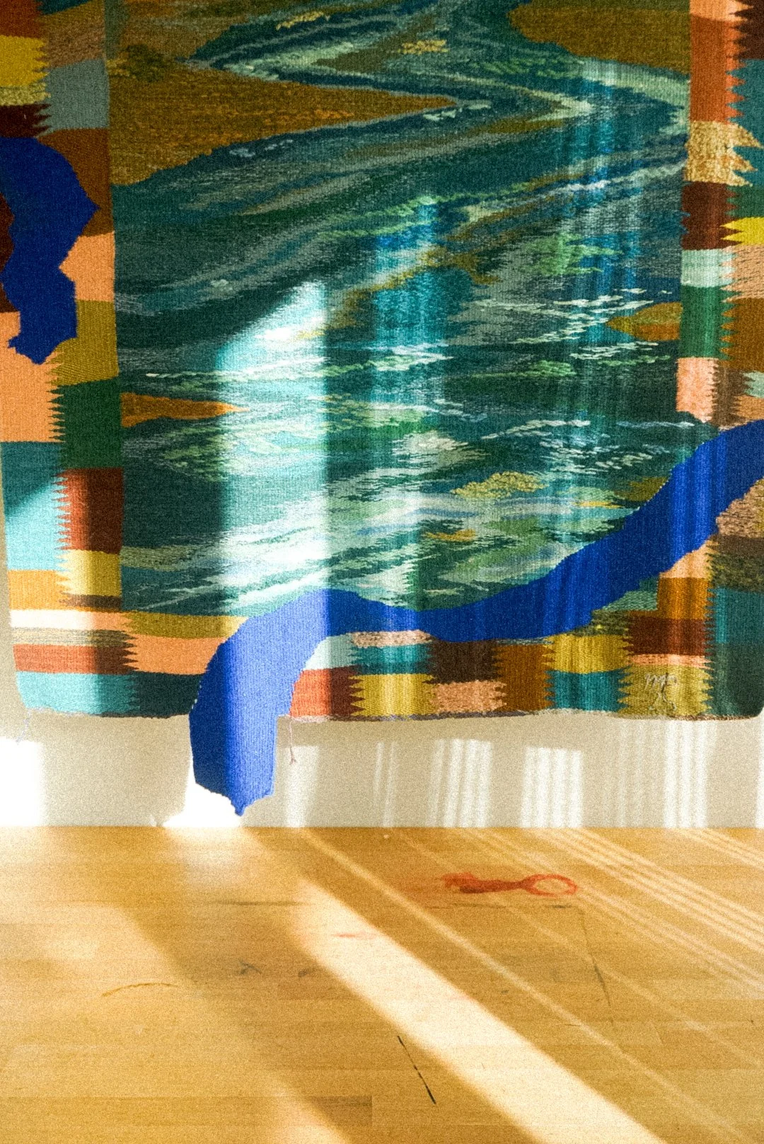 Buffalo River/Blue Jean Country Queen Miriam Parkman April 1, 2026 A tapestry finished after a trip to Arkansas last spring, with support from the Swedish Arts Grants Council.